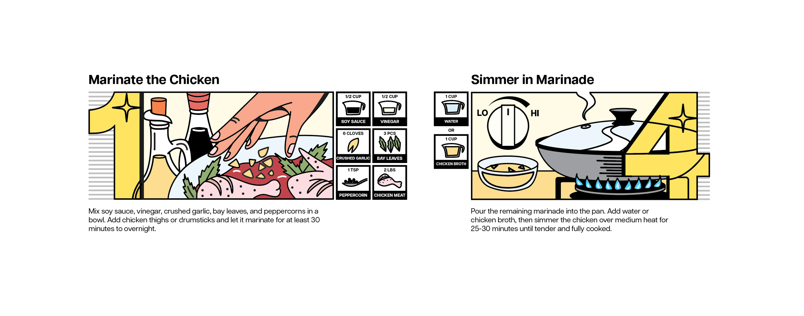 A bold, comic-panel style infographic with 6 clear steps (marinate → sear → sauté aromatics → simmer → reduce/thicken → serve) supported by icon-based measurements and “helpful sidebars” that answer common failure points.